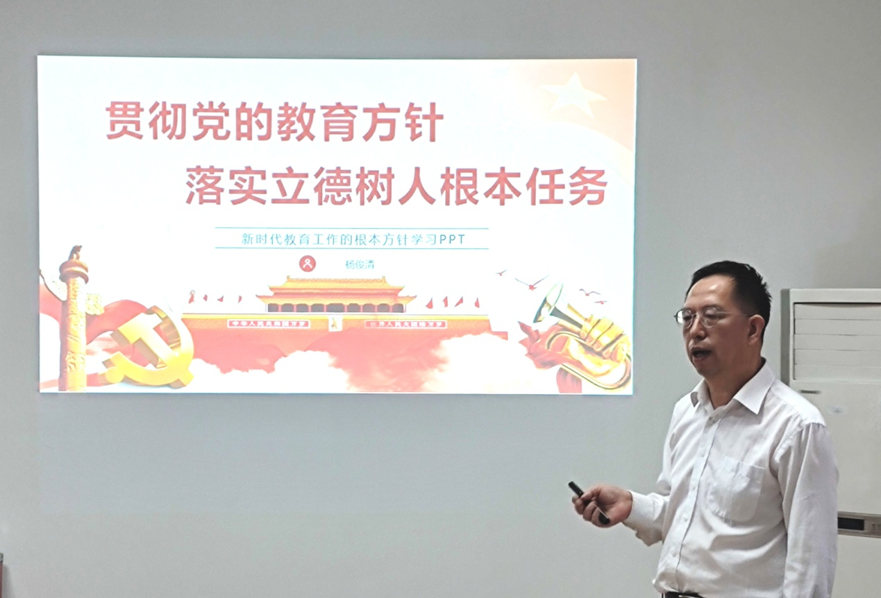杨俊清首先从“新中国社会主义教育方针的提出和形成”及“中国特色社会主义教育方针的发展与完善”等两个部分,介绍了党的教育方针在不同历史阶段的发展和变化;在第三部分“新时代党的教育方针的总要求和特点”中,杨俊清指出,扎根中国大地办教育是习近平总书记关于教育的重要论述的重要内容,是中国教育发展规律的新认识,是办好中国特色社会主义大学的根本遵循。在第四部分“顺应时代发展需要,不断提升教育教学水平”中,杨俊清结合beat365英国官网网站实际,向教职工汇报了学院下一步工作指导思想,即以工程教育认证和硕士单位申报为抓手,以新一届岗位聘任、聘期年度考核为政策引导,强化引导和服务,为学院高质量发展奠定扎实基础。