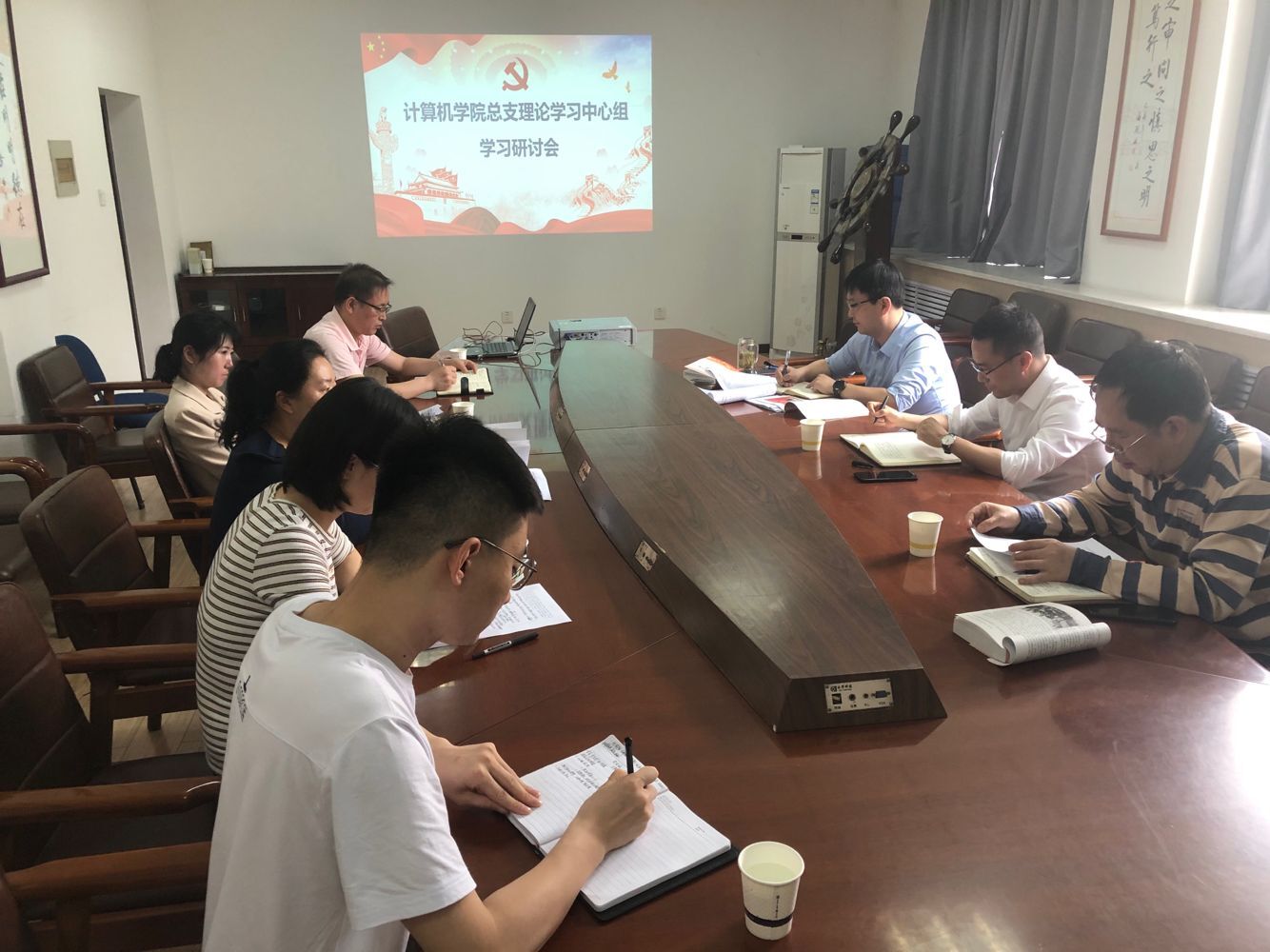 按照beat365英国官网网站党总支2021年理论学习中心组学习计划,beat365英国官网网站党总支于5月21日上午10:00在莲湖校区教学北楼319举行了理论学习中心组交流研讨会,主题为 “习近平总书记在党史学习教育动员大会上的重要讲话”和“新民主主义革命时期历史”的学习交流。党总支书记胡红亮主持会议,学校党委宣传部副部长战非到会指导,理论学习中心组全体成员参加。
