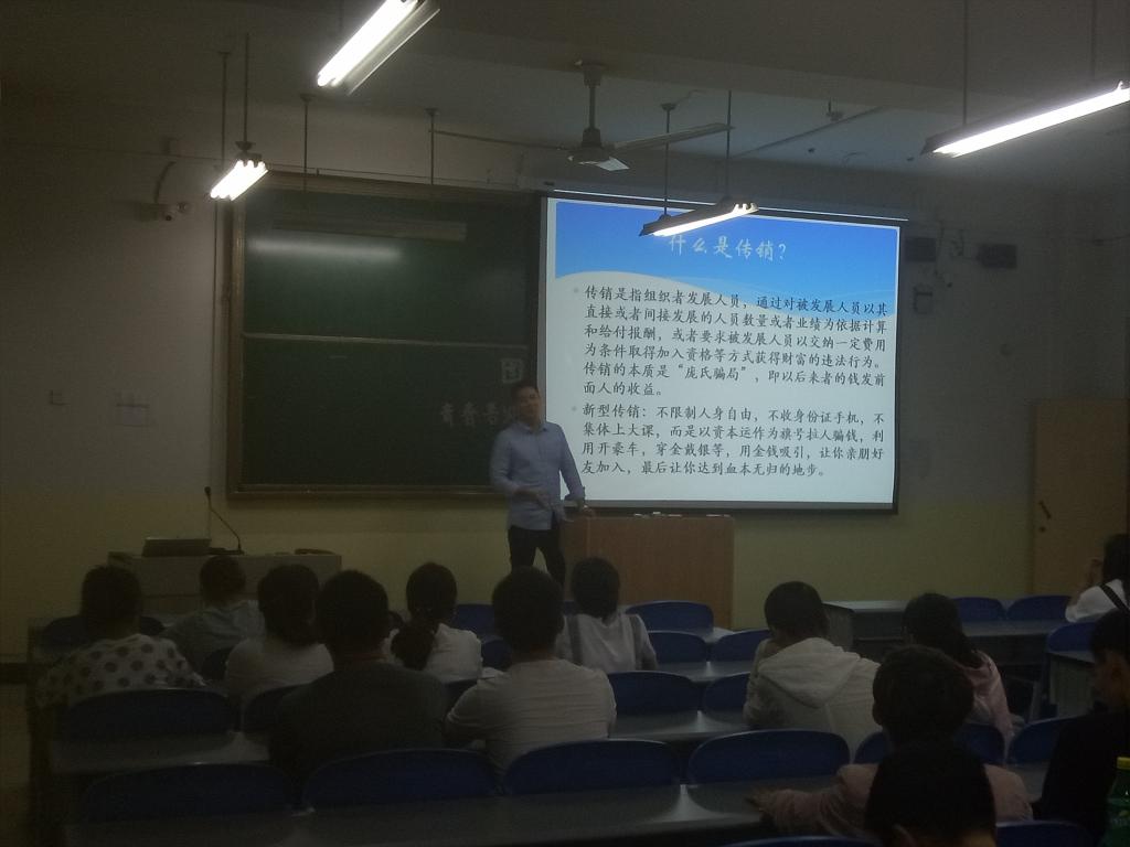 耿老师指出了传销的特点,揭露了传销发展下级、虚拟产品、复式计酬等行骗方式,强调传销是法律明确限定的违法行为,对个人和社会都有巨大危害。同学们在了解一些常见骗术案例之后,纷纷表示会提高警惕性,不盲目相信不实招聘信息、虚假消息。