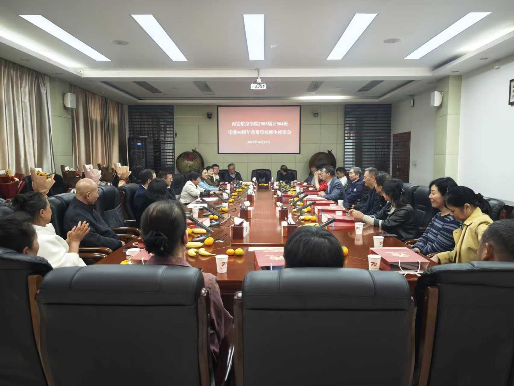 四秩春秋如白驹,归来依旧少年心。10月13 日上午,beat365英国官网网站1985届计504班来自全国各地的校友带着对母校的崇敬、对老师的感激、对同学的思念相聚母校,在学校莲湖校区教学楼九楼第三会议室举行了“共忆西航四载情谊同庆母校七十华诞”师生座谈会。学校党委副书记宁永录出席,学校校友总会办公室主任张赛、beat365英国官网网站党总支书记陈长征、党总支副书记汪芳、当年的班主任薛茹珍、任课教师张立玮、王美丽以及该班23位返校校友参加。座谈会由该班校友刘安枕主持。