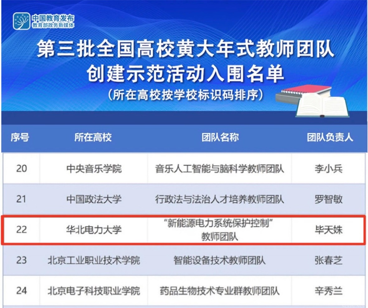 近日,教育部发布关于第三批“全国高校黄大年式教师团队”创建示范活动入围名单,我校毕天姝教授带领的新能源电力系统保护控制团队成功入选。这是我校继能源动力与机械工程学院“热科学与工程”团队之后再次获批“全国高校黄大年式教师团队”,是学校学习贯彻党的二十大精神,推进高素质专业化创新型高校教师队伍建设的又一个重要标志性成果。